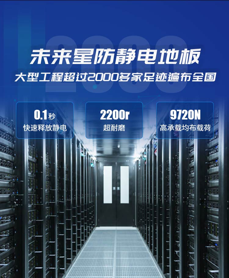 未來星防靜電地板深耕行業20多年,是大型建筑工程防靜電地板生產基地,公司已與航天航空、國家電網、高鐵站、地鐵站、衛星基站等1000+大型工程達成合作。我們秉承高品質,重服務的精神,認真對待每一位客戶”